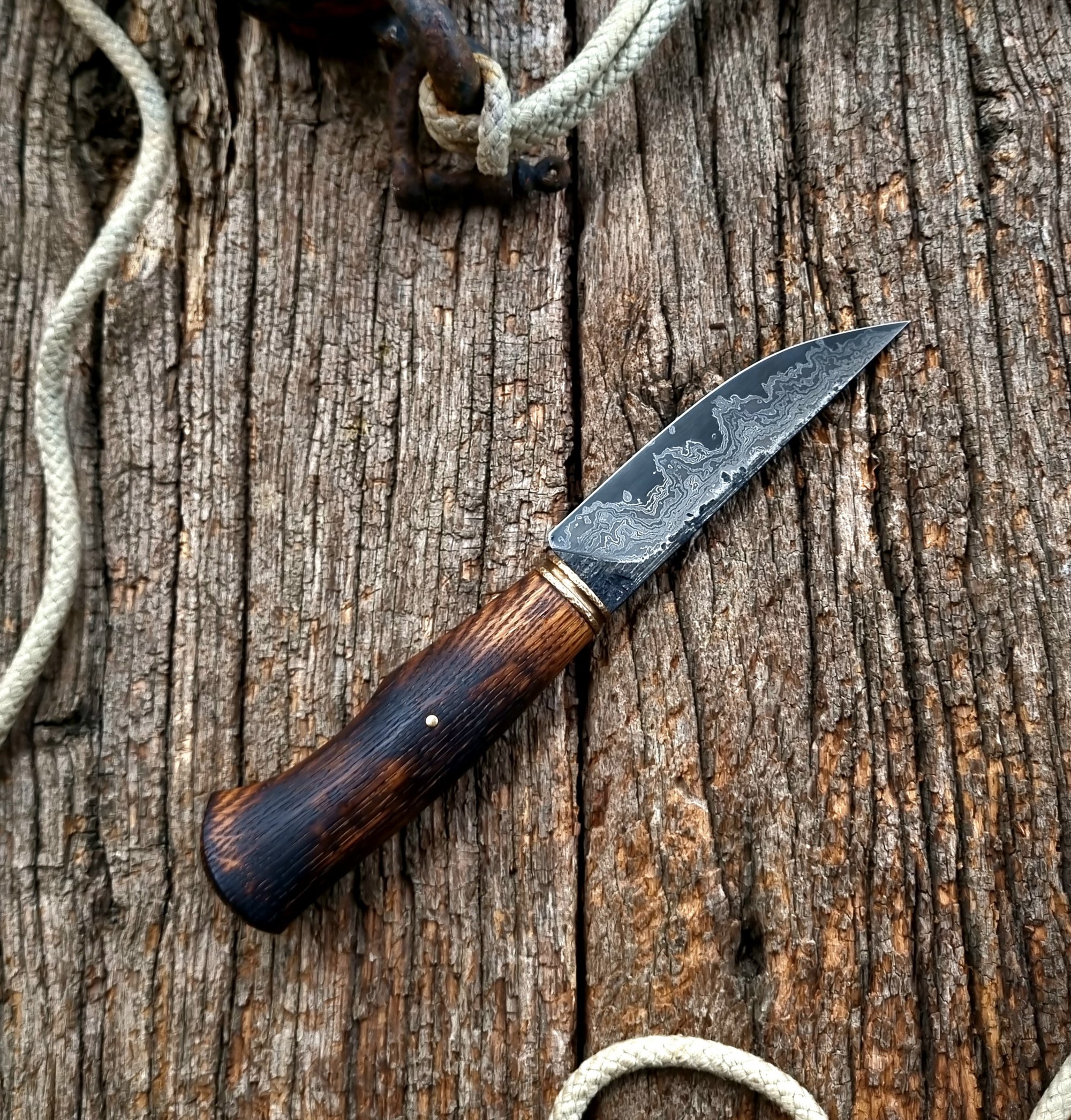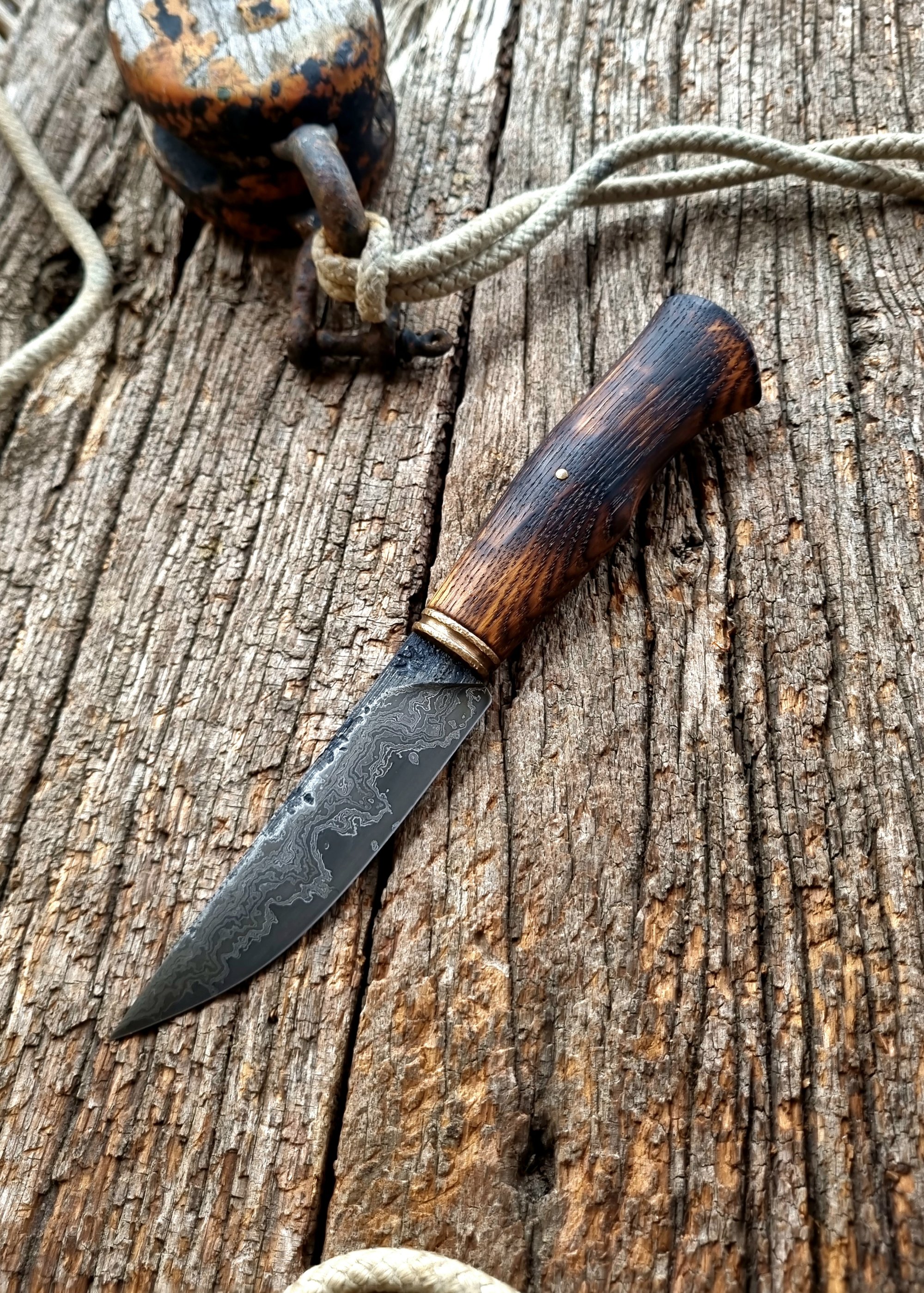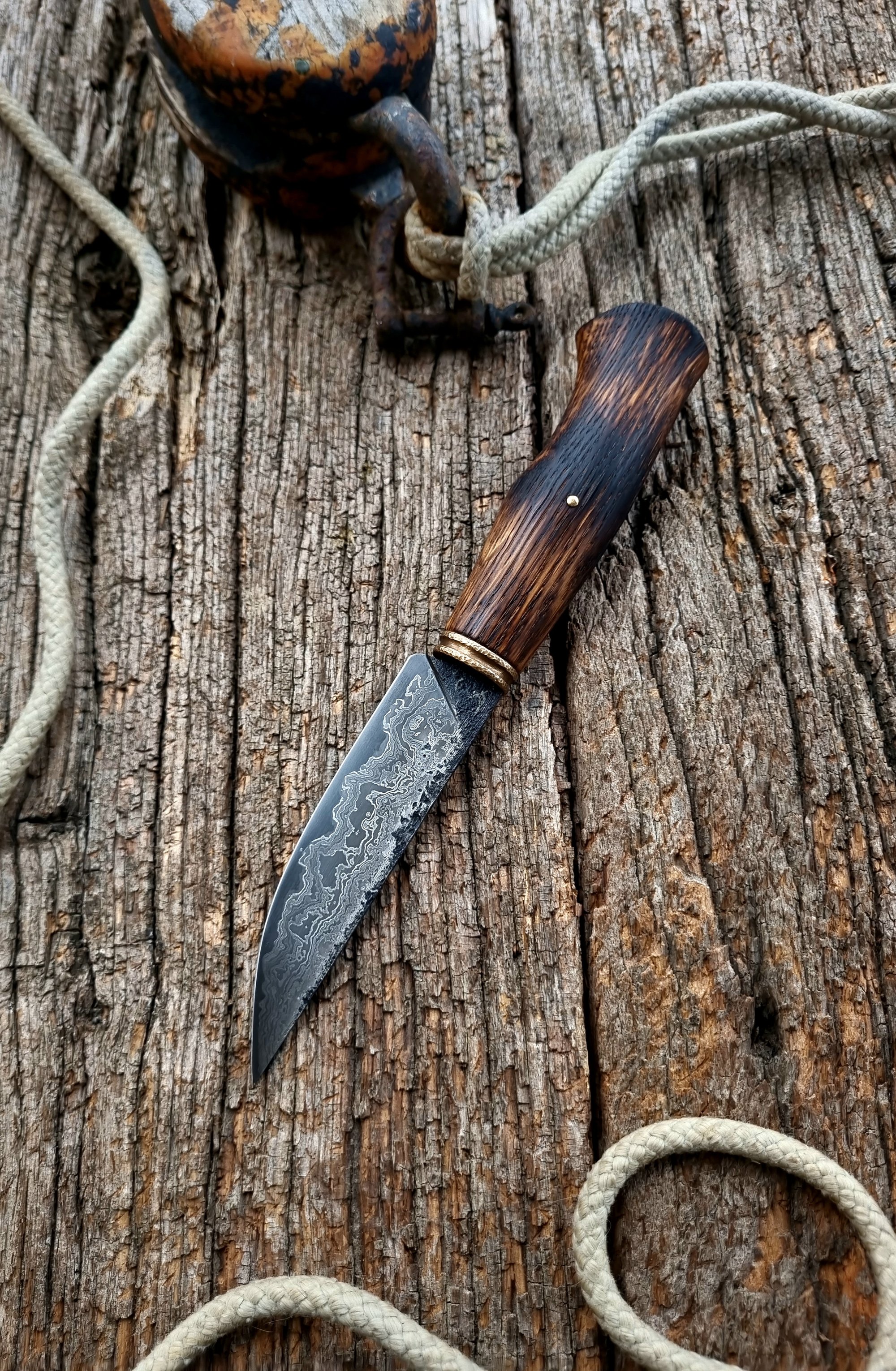 La garde est en bronze martelé et patiné et manche en chêne texturé et flammé.
